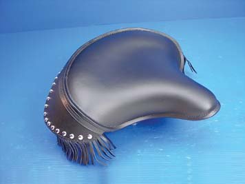 Solo seat features black leather skirt with orange rosette, nickel spots and 4" fringe. Seat has a molded foam pad on an accurate steel formed and ribbed baseplate with brackets riveted in place as original. Authentic style seams are created by riveting a leather strip to the seat pan and then from fitting the leather cover to the saddle and finally sewing the cover to the strip. Seat fits stock T's. Order mount kit separately. Fits:EL 1936-1940FL 1941-1984WL 1929-1952VL 1930-1936UL 1937-1948G 1937-1972 UOM: 1 - EA Material: Leather Style: Police 2011 Catalog pages: 1207 Measurements Length: 16" Front Width: 5" Rear Width: 16" SAV for Harley Davidson Motorcycles