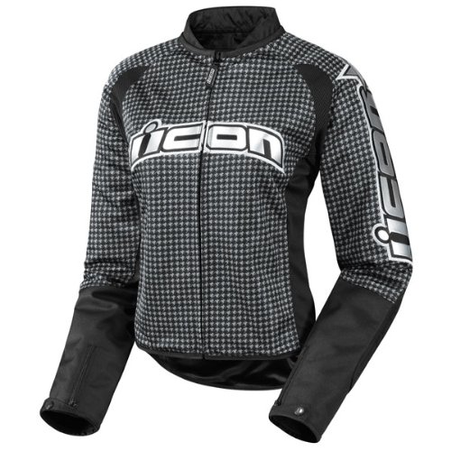 Fame, beauty and money like air, oil and gasoline are fleeting. Eventually the hard living and steady diet of rock roll will get you, but not yet. You've got some more living to do. Clad in a classic hounds tooth print and festooned in bold silver applique this world is an oyster you've yet to fully shuck. Icon women's relaxed fit Durable fighter mesh chassis for maximum venting Removable Icon CE field armor impact protector elbow and shoulder Removable Icon dual-density foam back pad Heavyweight ballistic impact panels Stretch panels for increased mobility Lined collar for comfort Internal zippered pocket for secure storage Removable insulated wind resistant liner Upgradable to Stryker CE back protector