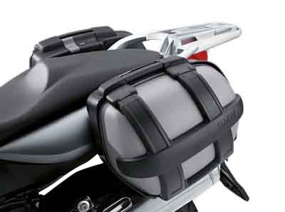 - BMW Genuine Motorcycle SPORT CASES Left -- Capacity expandable from approx. 17 to 25 I / .6 to to 88 cf -- Water-resistant -- Easily adjustable via ratchet straps -- Lockable -- Textilesteel webbing for enhanced anti-theft security -- Spacefor one helmet -- Suppliedwith waterproof inner bags