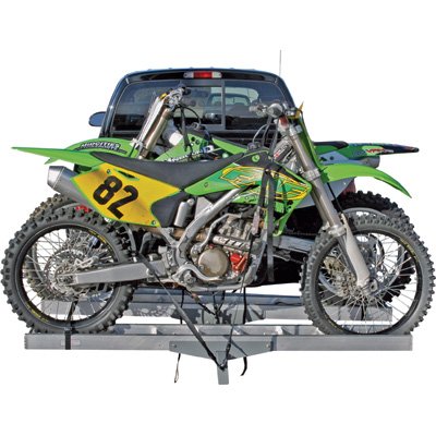 This is the ultimate solution for easy motorcycle transportation without all of the hassles that come with pulling and storing a trailer. Load your bikes with the extra-long ramp, tie them down and you're on your way. Specially designed for transporting motocross bikes, enduro bikes or off-road dirt bikes. 600-lb. total capacity; each rail's capacity is 400 lbs. This lightweight carrier is easily attached to any standard 2in. Class III or IV receiver hitch. Each rail is 75in.L x 5 1/2in.W with a 16in.L front wheel drop that serves as a stabilizing wheel chock. Loading ramp is 45 1/2in.L x 5 1/2in.W with a 3/4in.L hooked end to secure the ramp when loading. 75in.W x 55in.D overall. Application: Motorcycle,Platform Size L x W (in.): 75 x 55,Receiver Size (in.): 2,Capacity (lbs.): 600,Compatible With: Class III, IV